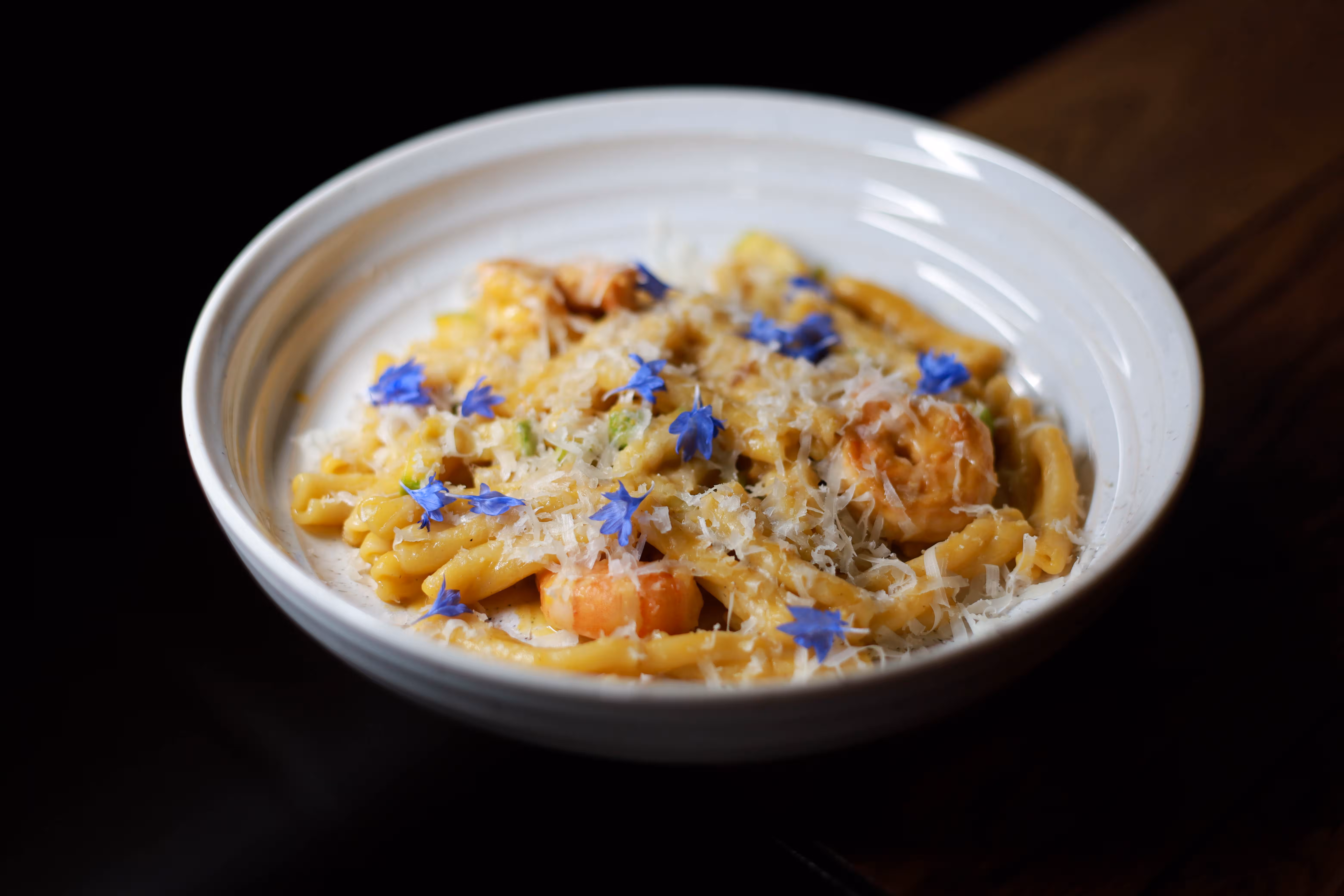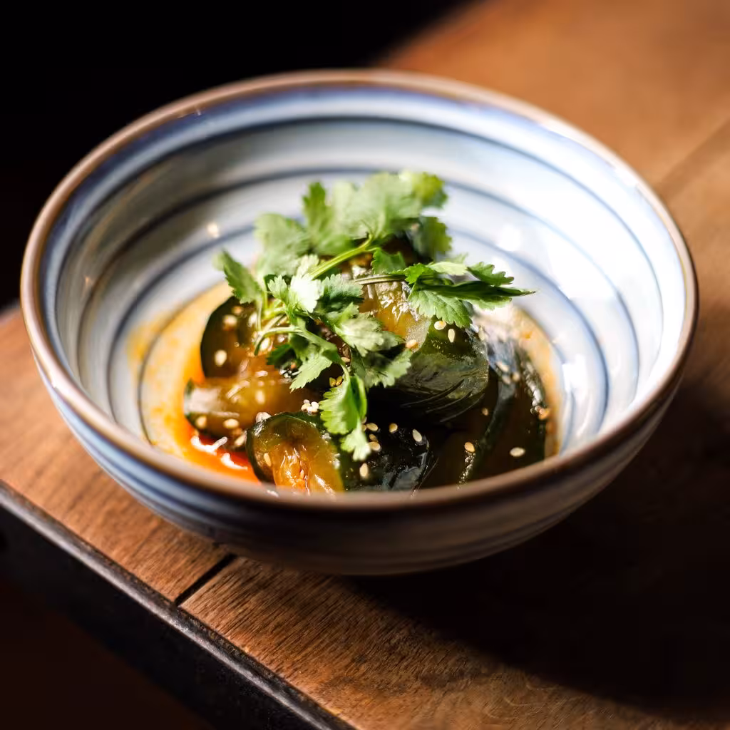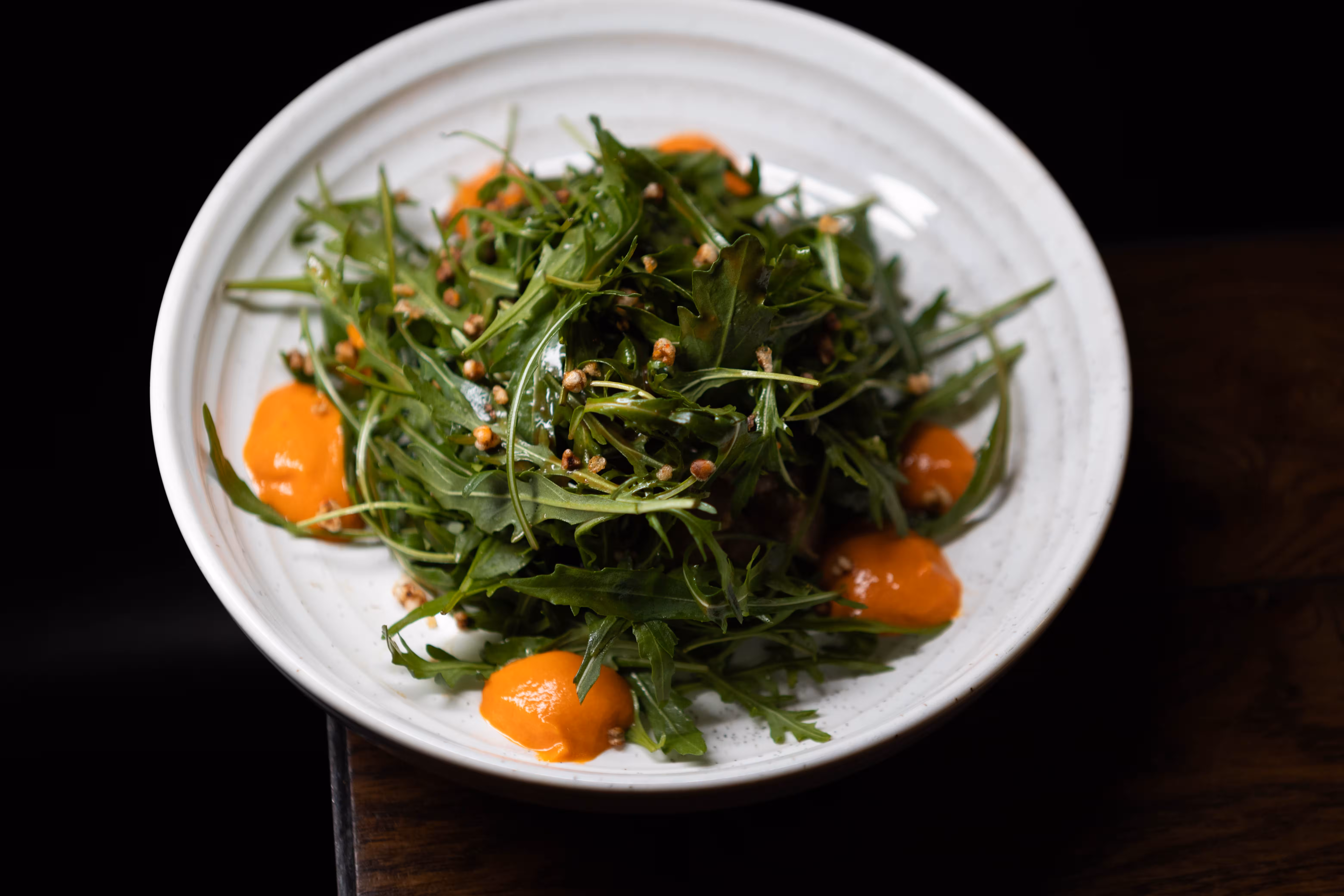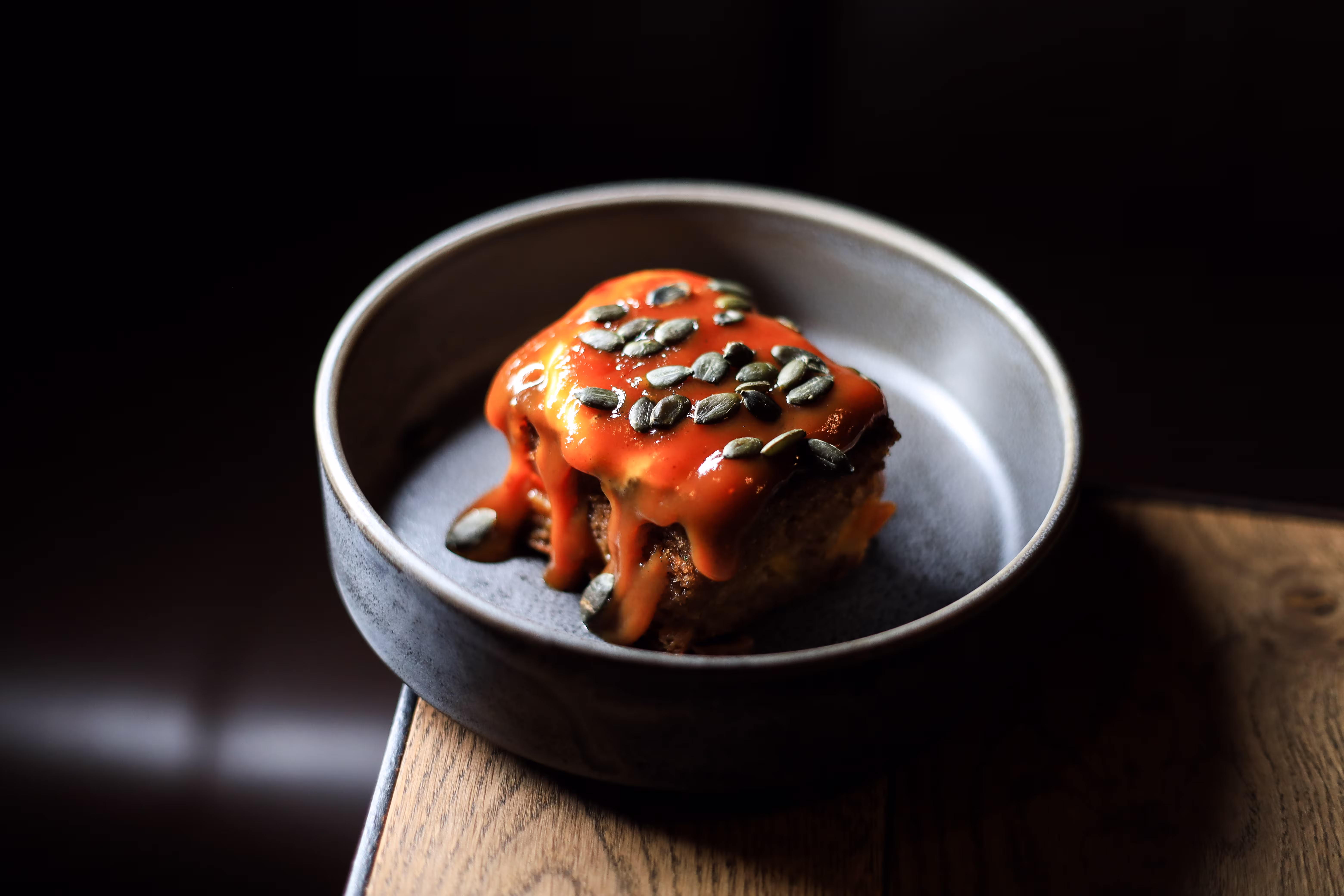 С кунжутом кимчи, пармезаном, кремом из запеченной тыквы, шалфея и яблок (можно добавить курочку за 250 ₽ или креветки за 300 ₽)
